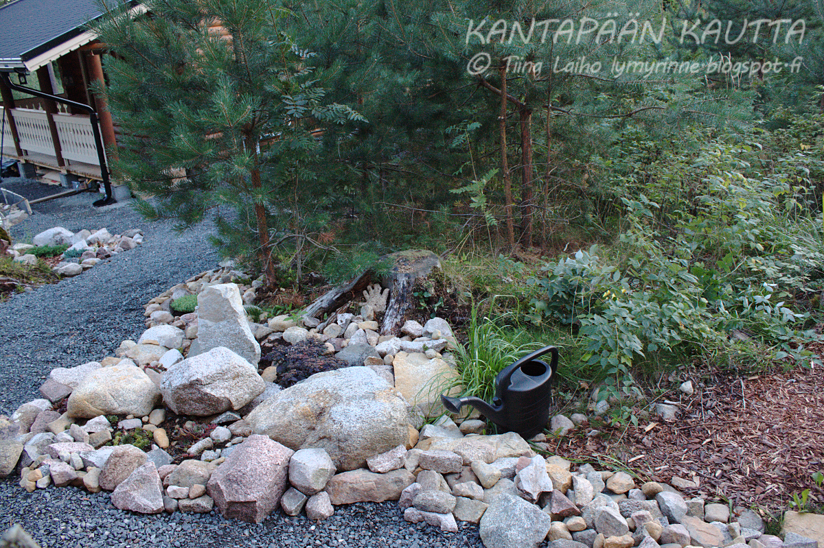 Tämä oli tällainen päähänpisto/kokeilu, joka itseasiassa näyttääkin ihan kivalta. En tiedä kuinka sepeli mahtaa toimia laattojen alustana mutta saanhan korjattua sitä myöhemmin, jos tarve tulee. Laattakivien reunoille sepelin ja puron/istutusten väliin haen lähipäivinä jotakin matalaa maanpeittokasvia somistamaan aluetta. Tällöin laattapolku uppoaa mielestäni paremmin kokonaisuuteen (kunhan kasvit runsastuvat). Lisäksi oikealle puolelle heti alimman laattakiven alle jätin paikan isommalle istutukselle. Mitä siihen istutan? Hmm... Taidan ratkaista sen puutarhamyymälässä. :)